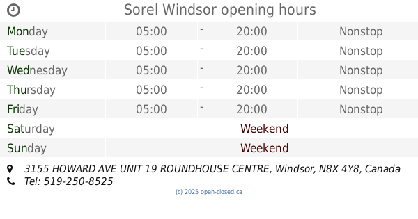 It is also possible to : Edit these OPENING HOURS of Store Sorel In Windsor, 3155 HOWARD AVE UNIT 19 ROUNDHOUSE CENTRE,